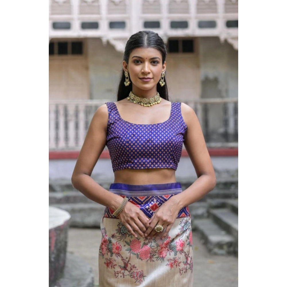 Women's Faux_Tussar Floral Jal With Patola Print Saree With Unstitched Blouse 5.5Mtr (Blue)