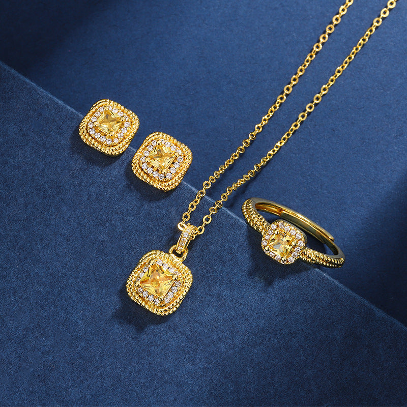 Women's Simple Small Sugar Cube Rings Ear Studs Jewelry Copper-plated Gold Jewelry Suit